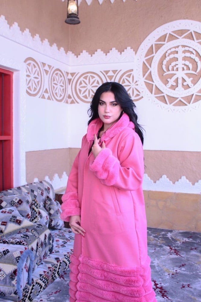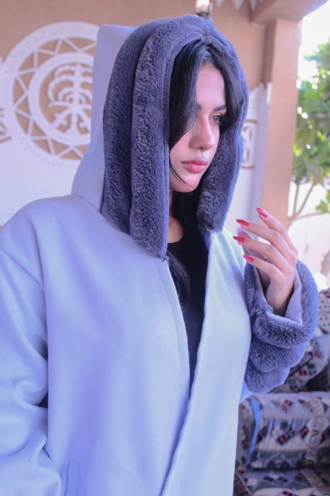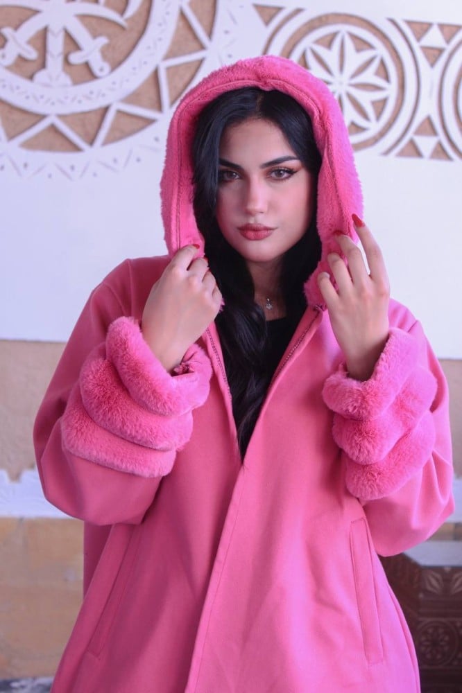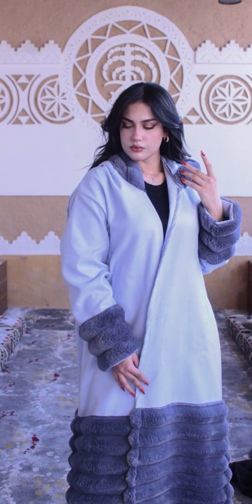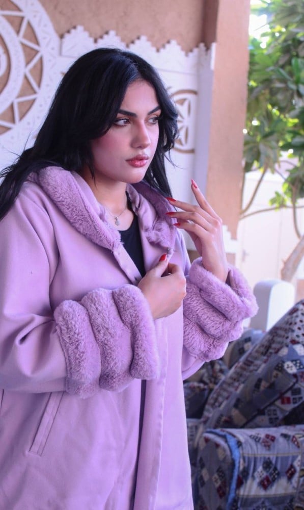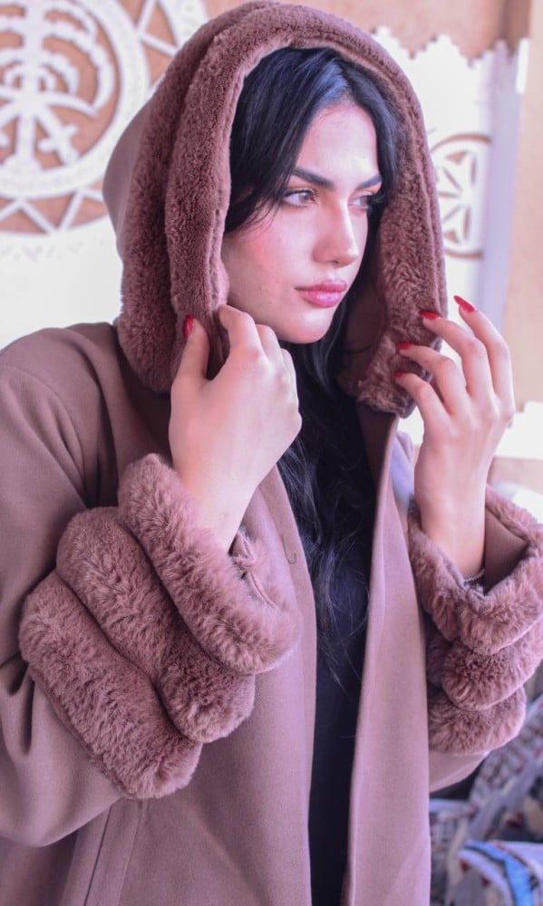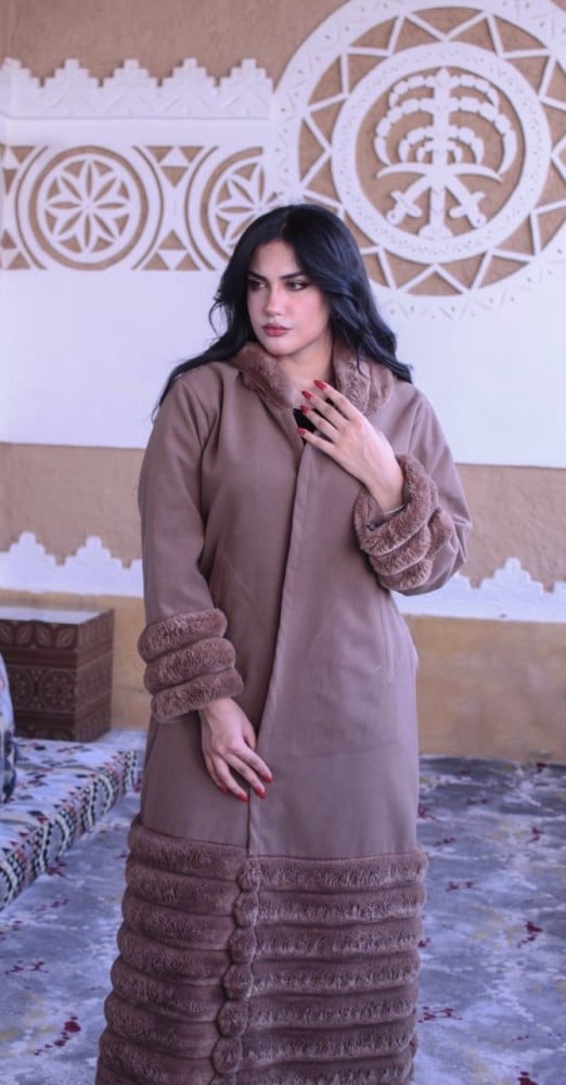 فروة نسائي قماش جوخ بفرو طويل ناعم من الخارج