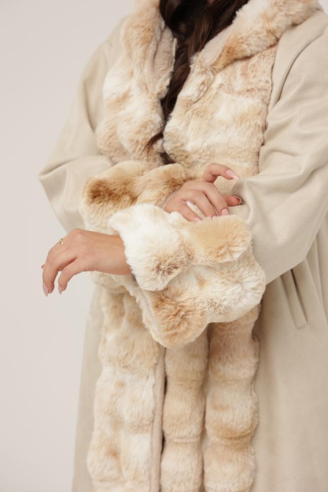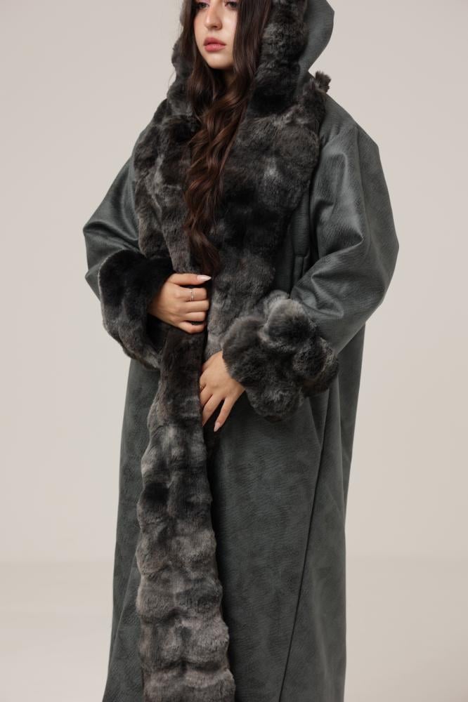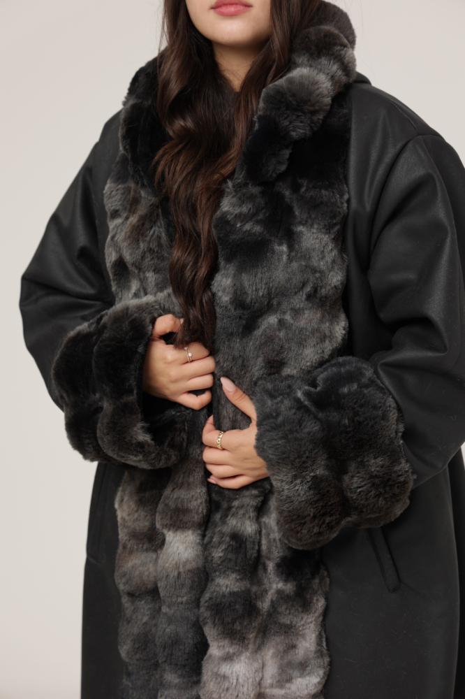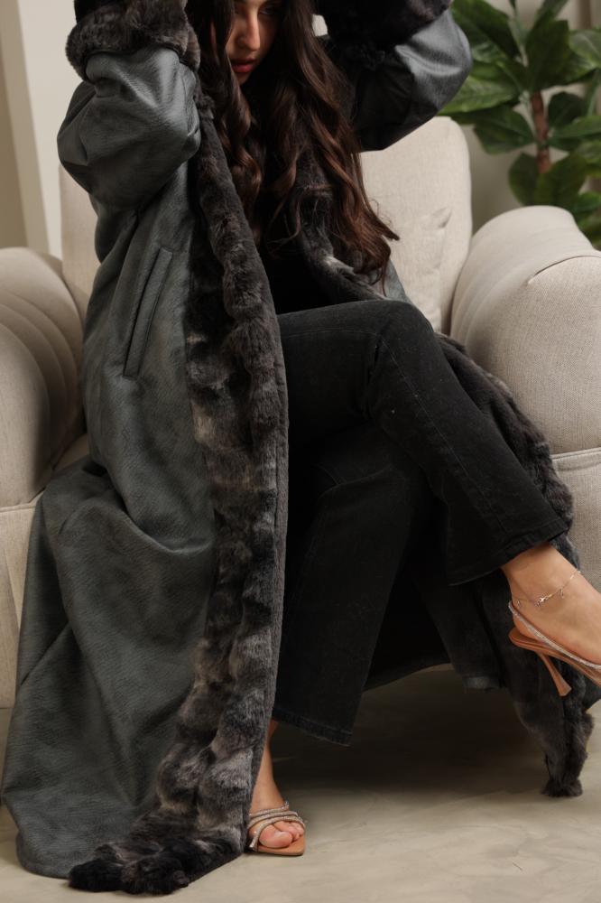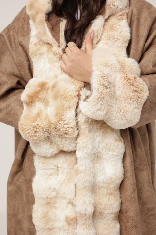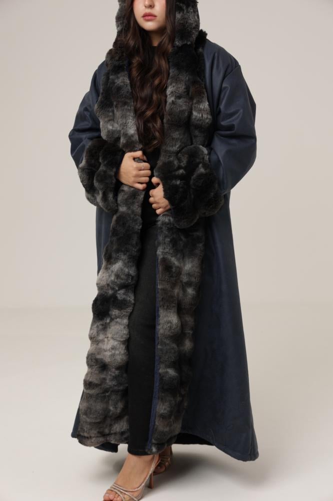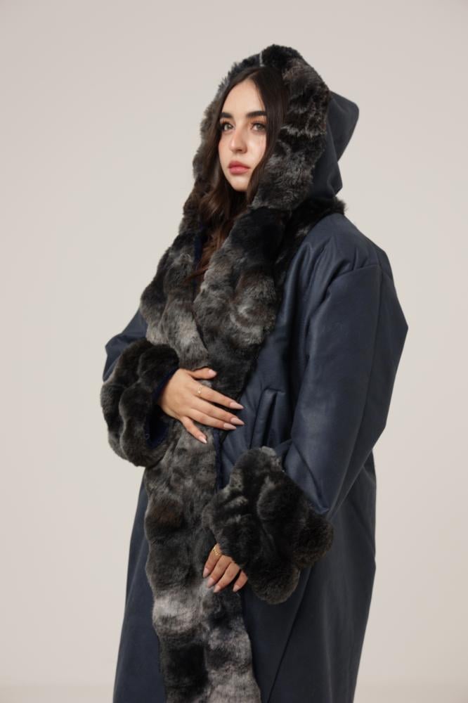 فروة نسائي قماش جلد مبطن بفرو من الداخل وفرو ارنب صناعي من الخارج