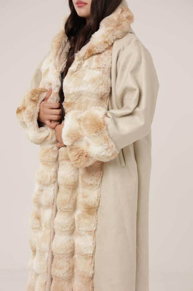 فروة نسائي قماش جوخ بفرو طويل ناعم من الخارج